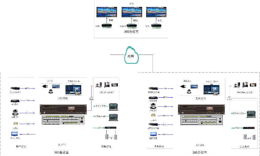 (2)项目包含:本项目共建设2间会议室,使用2台米兰(milan)科技(AVSYS)UT4录播主机、5台DSR分布式设备,实现统一控制管理,音视频调度等应用。