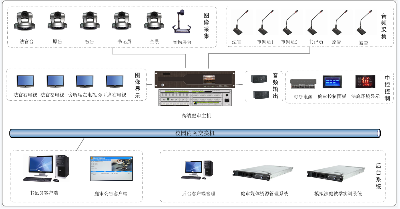 本项目共建设1个审理庭,其中包含一套庭审后台系统,一套模拟法庭教学实训系统,一台高清庭审主机,实现统一控制管理,音视频调度等应用。
