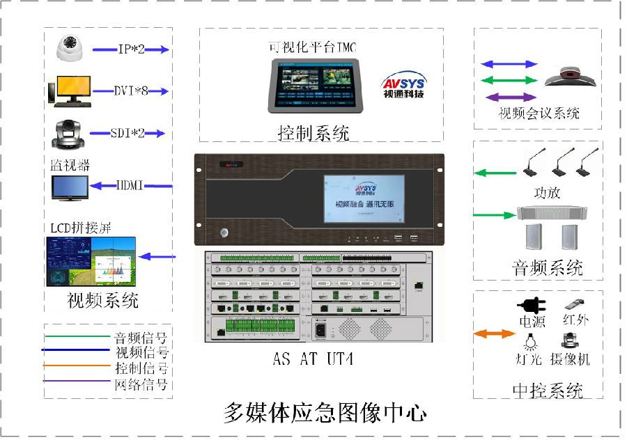 应急中心采用米兰(milan)科技自主研发的高度集成综合一体化主机AS-UT4,具备视频矩阵和拼接管理、安防监控管理、音频管理、录制及回放管理、中控外部设备管理、外围视频会议终端和主机自带视频会议双备份管理、可视化综合管理平台管理等功能。项目实现应急中心应急指挥保障、上下级单位视频会议的统一调度与管理。
