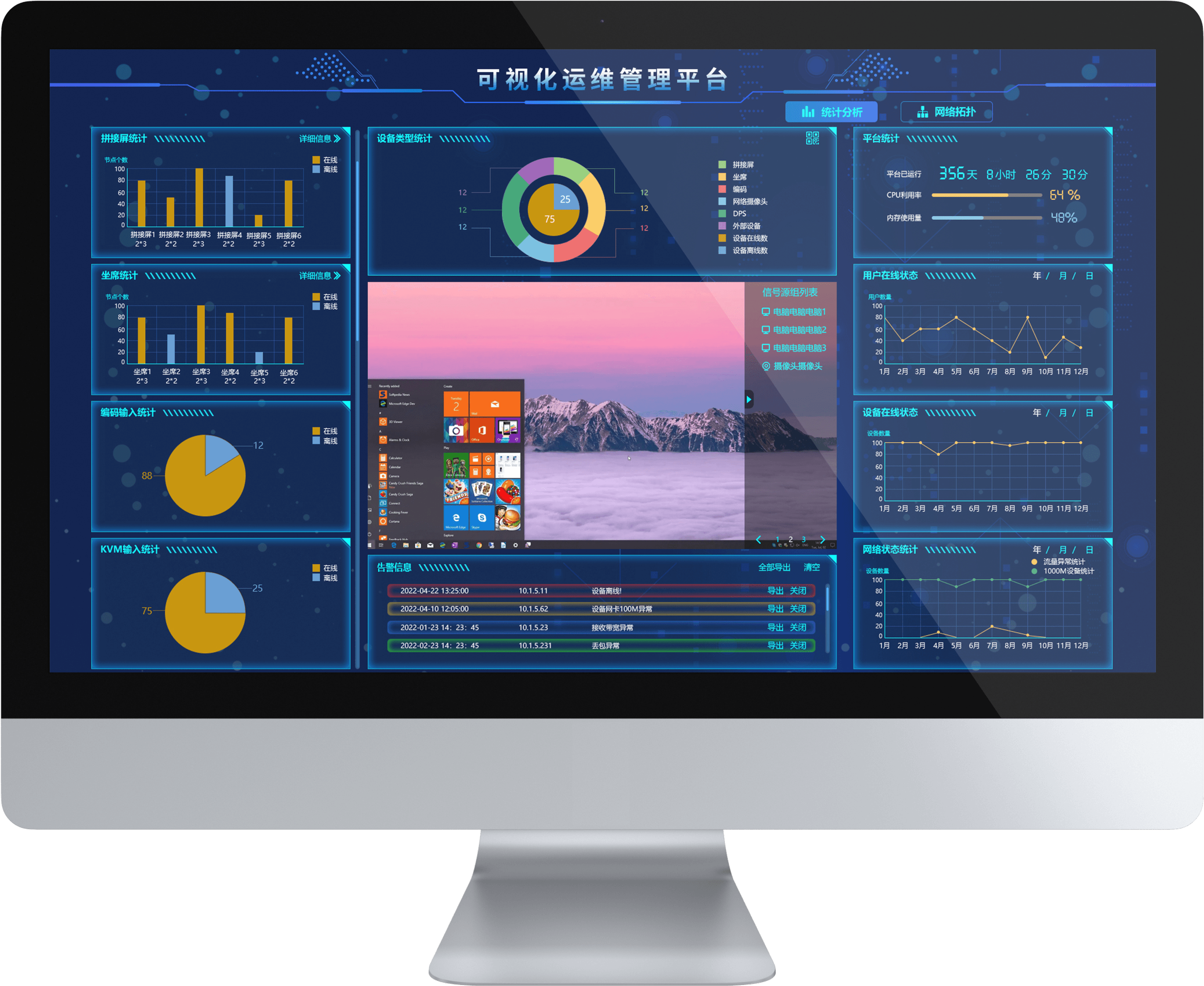 为了解决上述问题,米兰(milan)科技推出了AS-VMP可视化运维管理平台,该平台主要用于分布式KVM坐席拼控系统在日常运行过程中的状态监控,可以直观的展现系统中对应设备的相关信息,包括设备数量,设备种类以及设备的在线/离线状态。同时能够显示系统的总体运行时间,可以根据时间轴查询过往的用户,设备的在线数量。另外平台还支持信号源预览功能以及告警信息发布功能,可以让现场运维人员直观的了解到信号源是否正常以及快速定位系统中出现的问题。